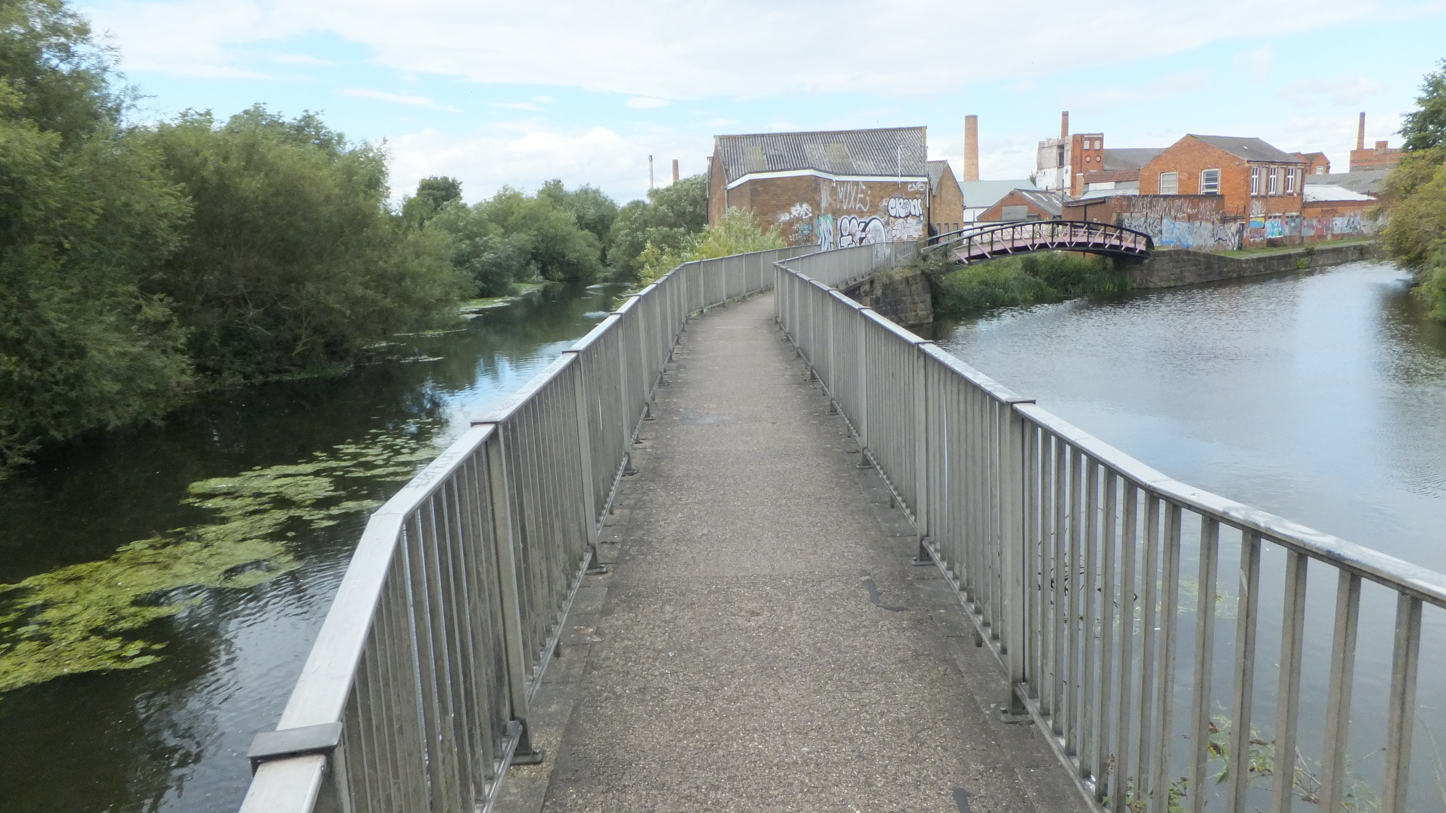 Cutting back down North Gate and turning east along the canal, we came out to the River Soar and turned south. The sweeps of the river which here beautifully meanders, wash, almost closely, a large extent of town, affording an agreeable prospect on the left, and a slope finely diversified with groves and pasturage descends gently to the meadows on the right.
