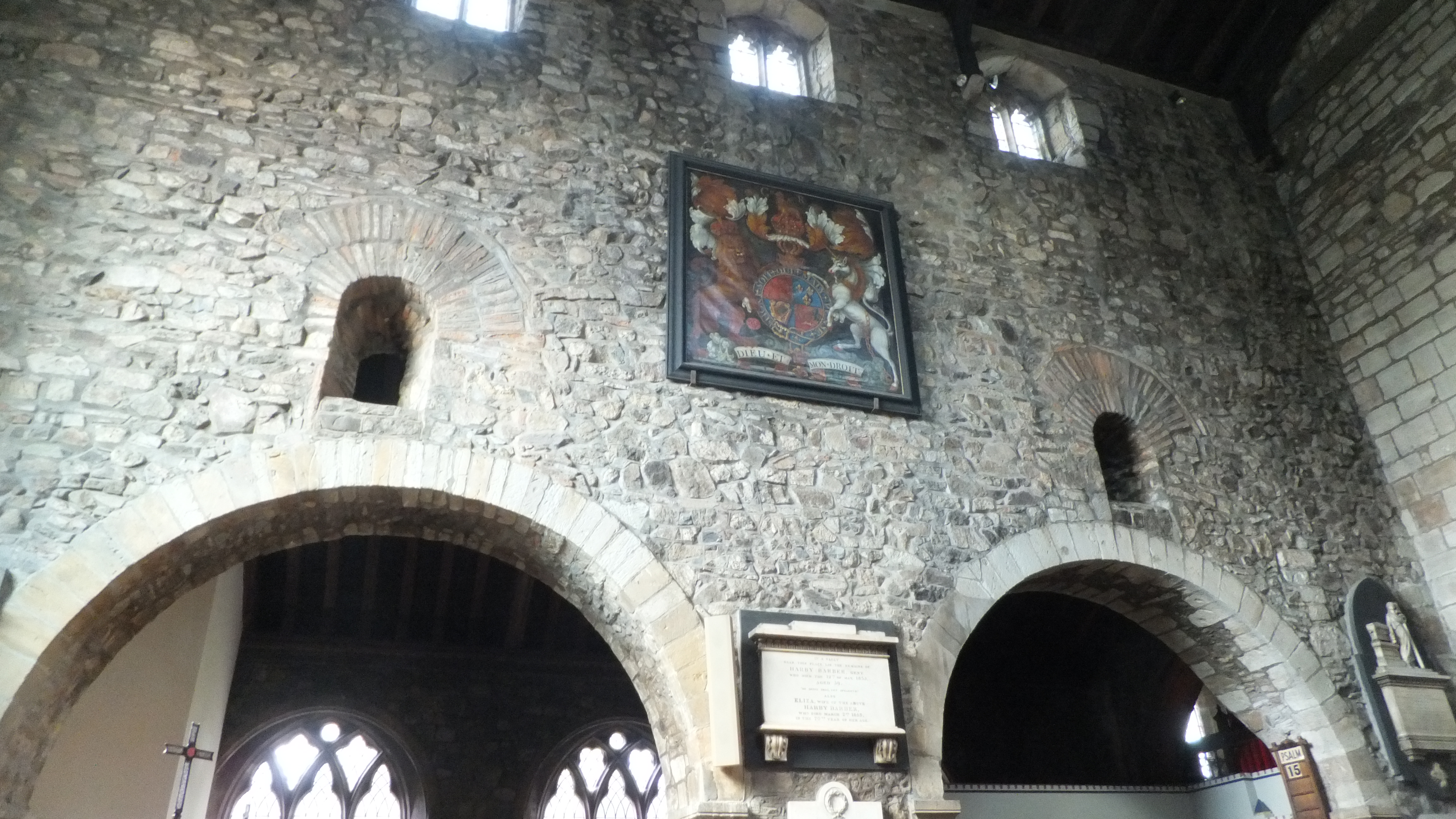 The adjoining church of (26) St. Nicholas is a small edifice of very rude and consequently very antient construction. It has evidently been built at different periods. It consists only of two aisles, the north one having long since been taken down; the south aisle is gothic, and the other, properly the nave, is of that massy unornamented style, in use before and at the conquest; from the circumstance of its being built with the materials of the neighbouring Roman work, it will perhaps be no anachronism to assign to it a date prior to that period. The tower is also Saxon; and the spire having been damaged by the wind is now taken down.